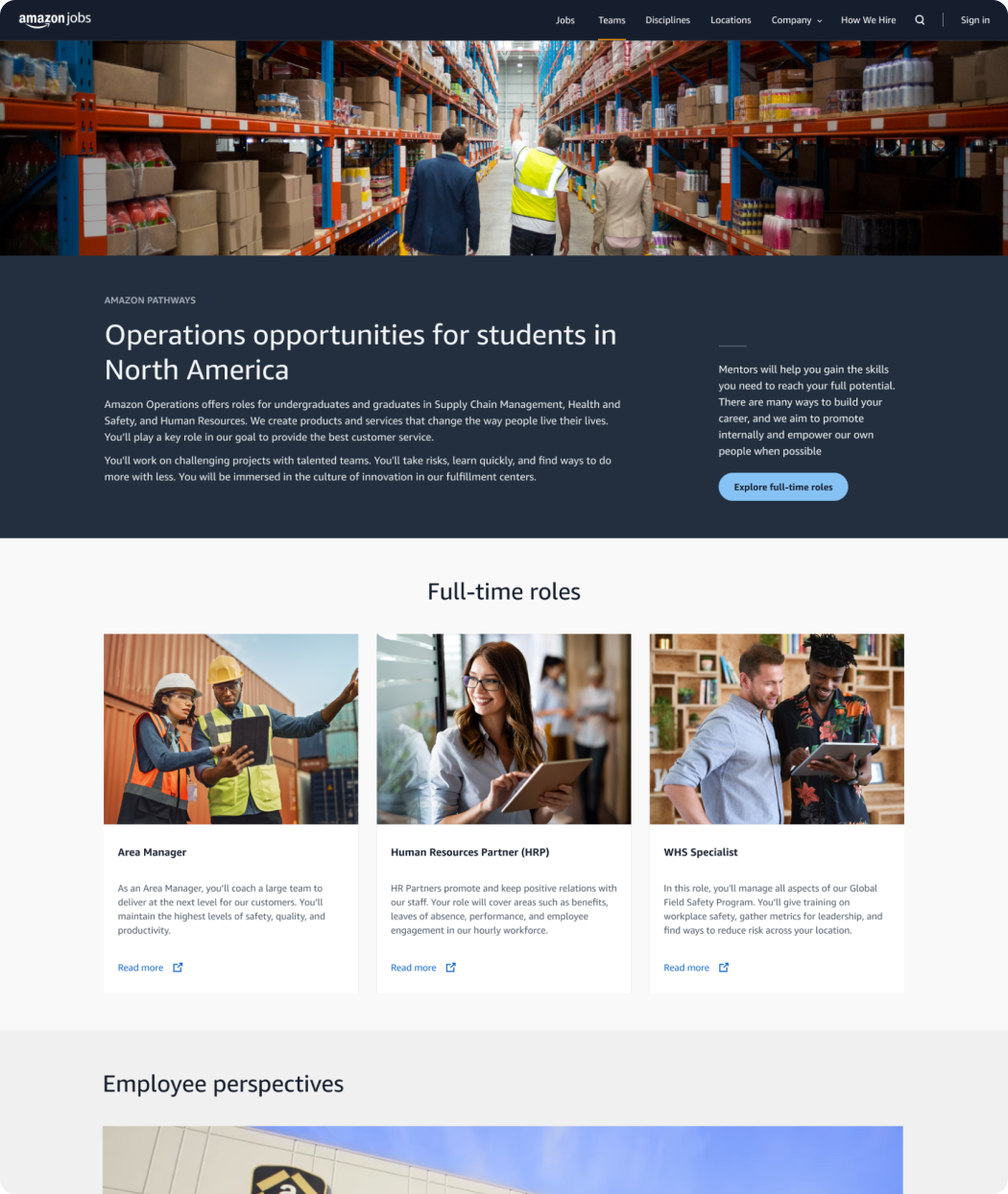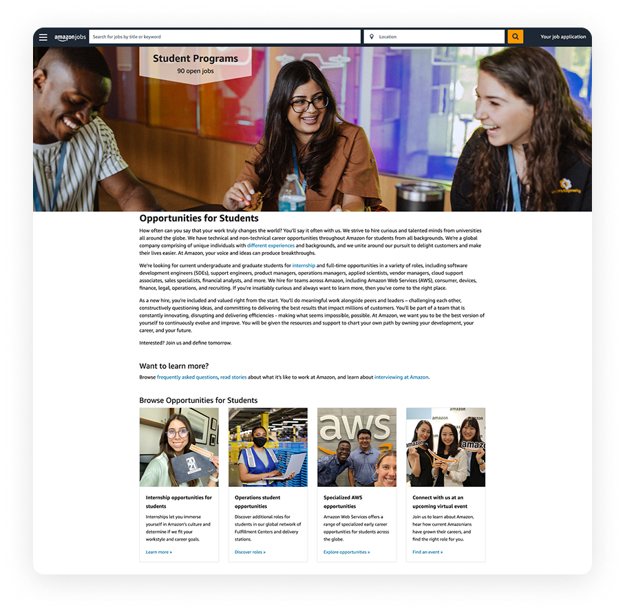The existing state of Amazon’s career site posed significant challenges. With over 100 million unique visitors annually, the platform was costly to maintain and offered limited flexibility for innovation. Inconsistent design patterns, accessibility shortcomings, and subpar mobile optimization created a fragmented user experience—ultimately contributing to missed opportunities in attracting and retaining top talent.